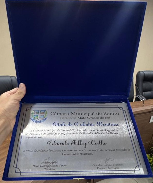 No dia 1º de outubro, a Câmara Municipal de Bonito realizou uma Sessão Solene de Homenagem e Entrega de Título de Cidadão Bonitense e Honorífico. Entre os homenageados, Eduardo Coelho, Diretor do Grupo Rio da Prata, recebeu o Título de Cidadão Bonitense, concedido por proposta do vereador Adão Duarte.