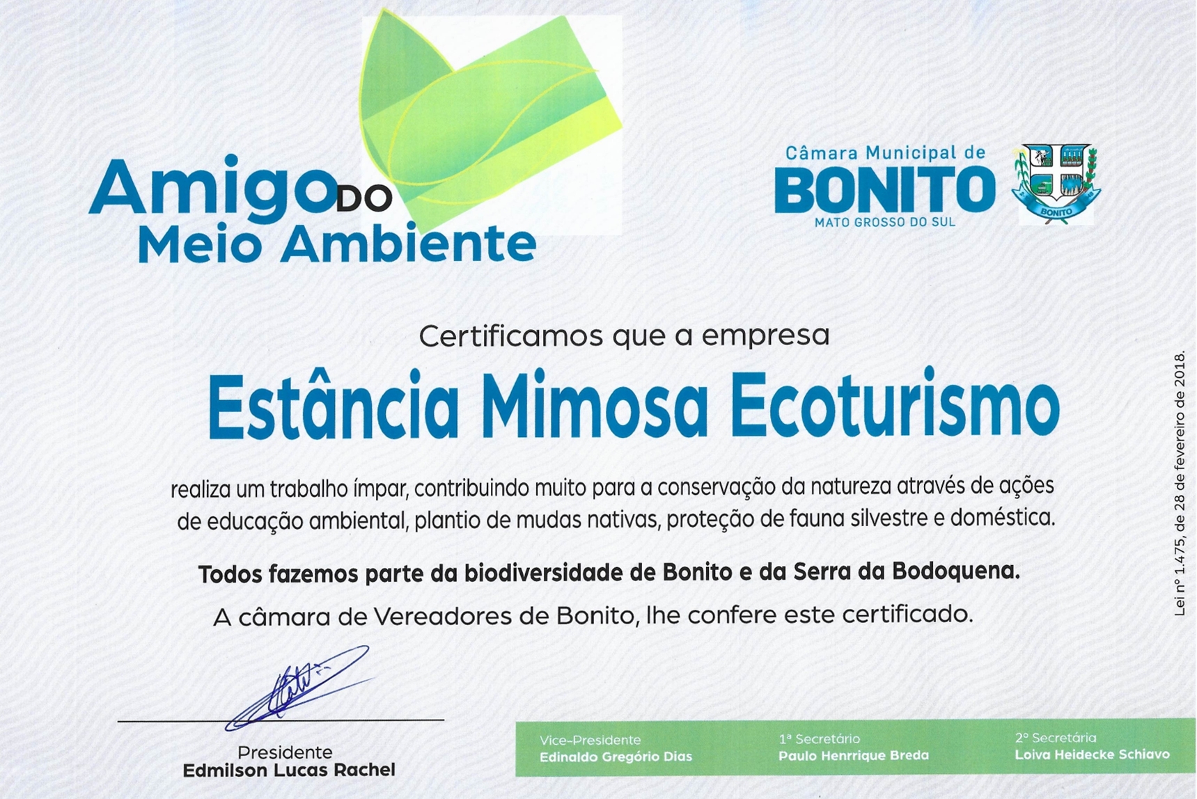 A Estância Mimosa Ecoturismo, passeio de cachoeiras em Bonito (MS), foi agraciada pela Prefeitura Municipal de Bonito, através da Secretaria de Meio Ambiente (SEMA) e a Câmara de Vereadores, com o título “Amigo do Meio Ambiente”.
